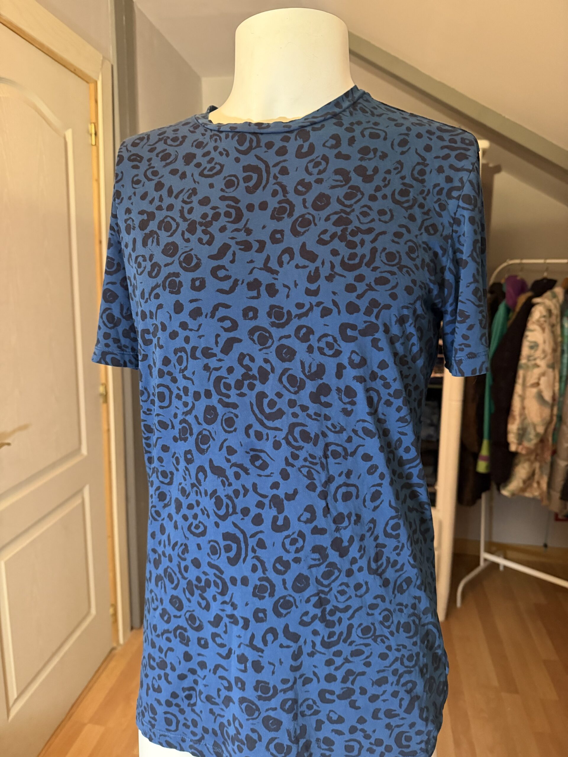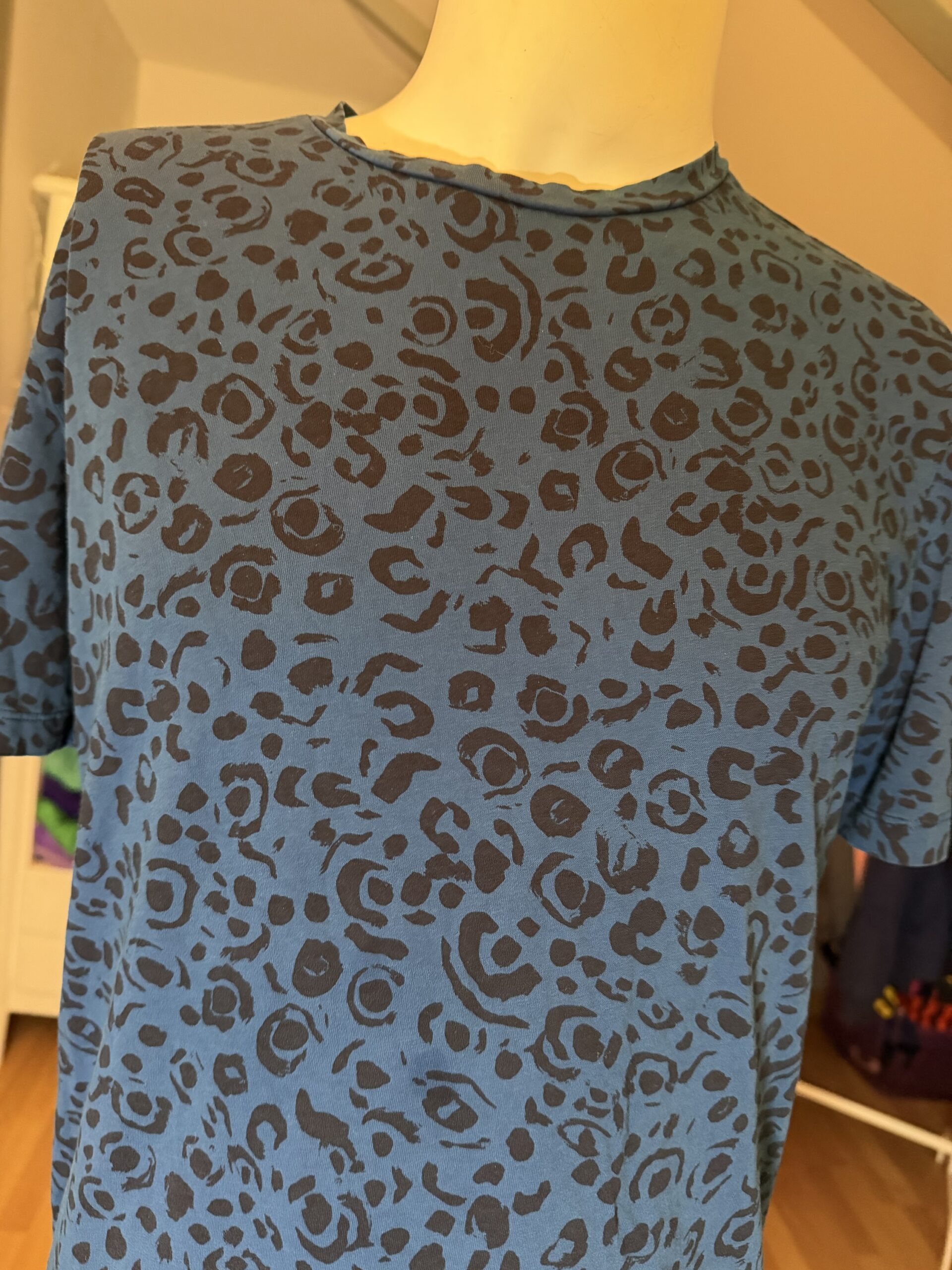 Diseño en color azul con estampado animal print en negro, cuello redondo y manga corta. Corte recto que queda bien tanto suelta como metida por dentro.