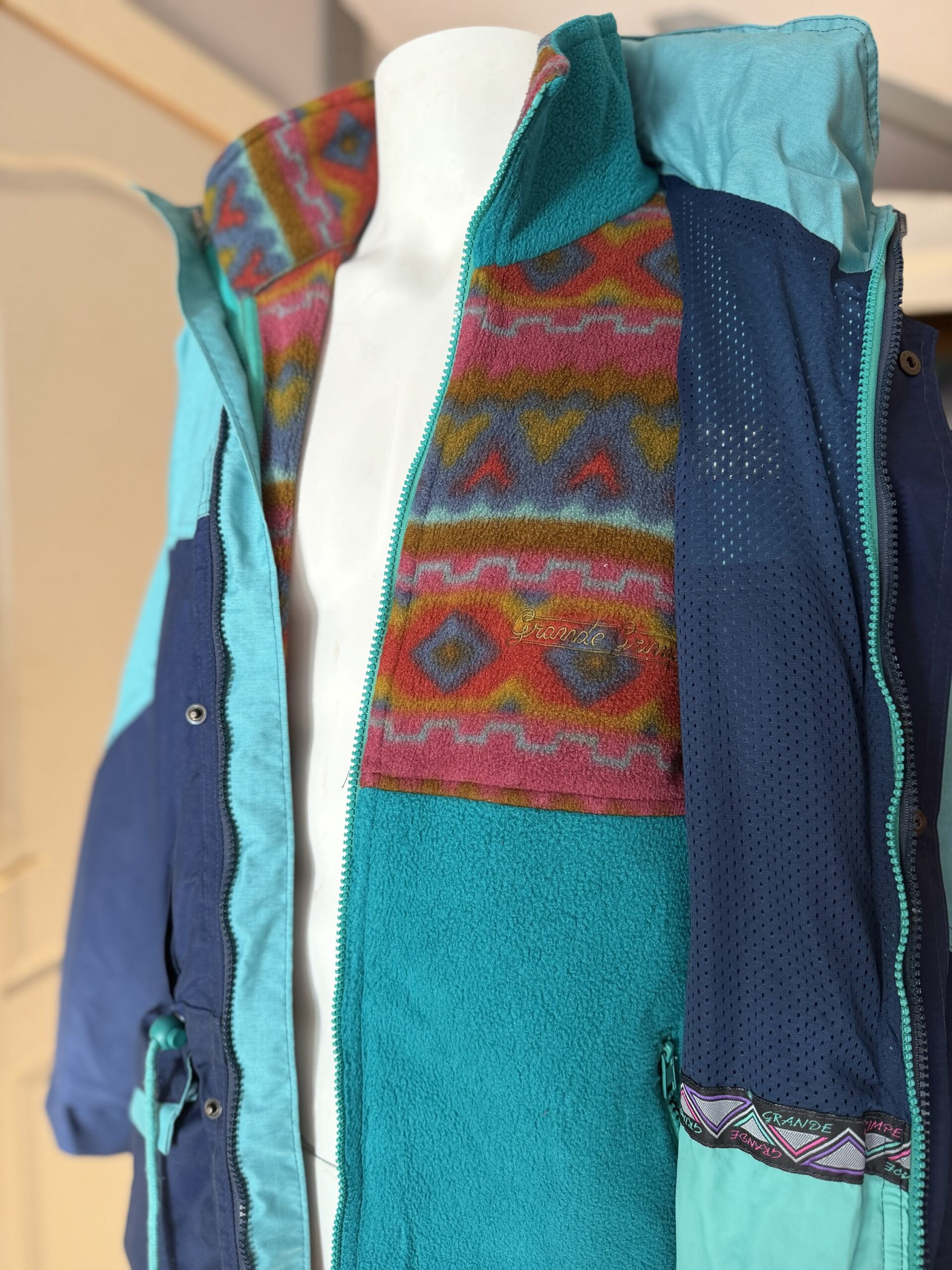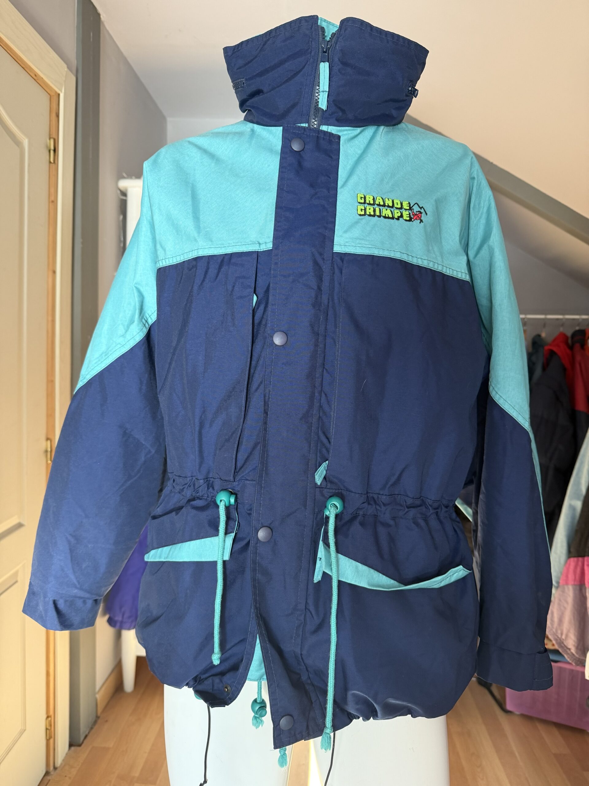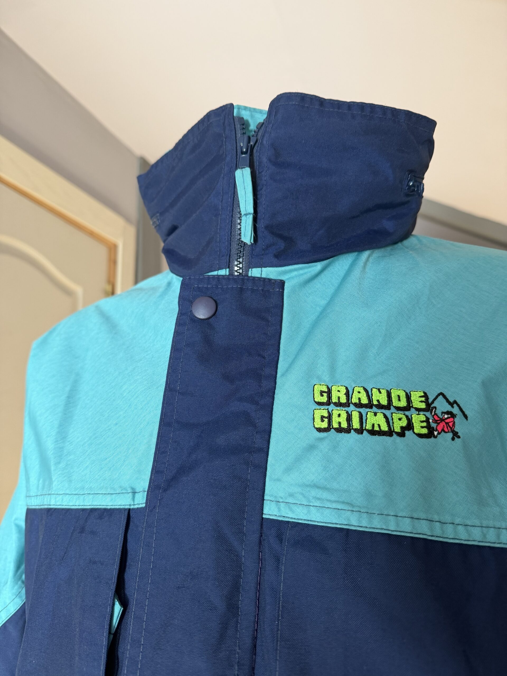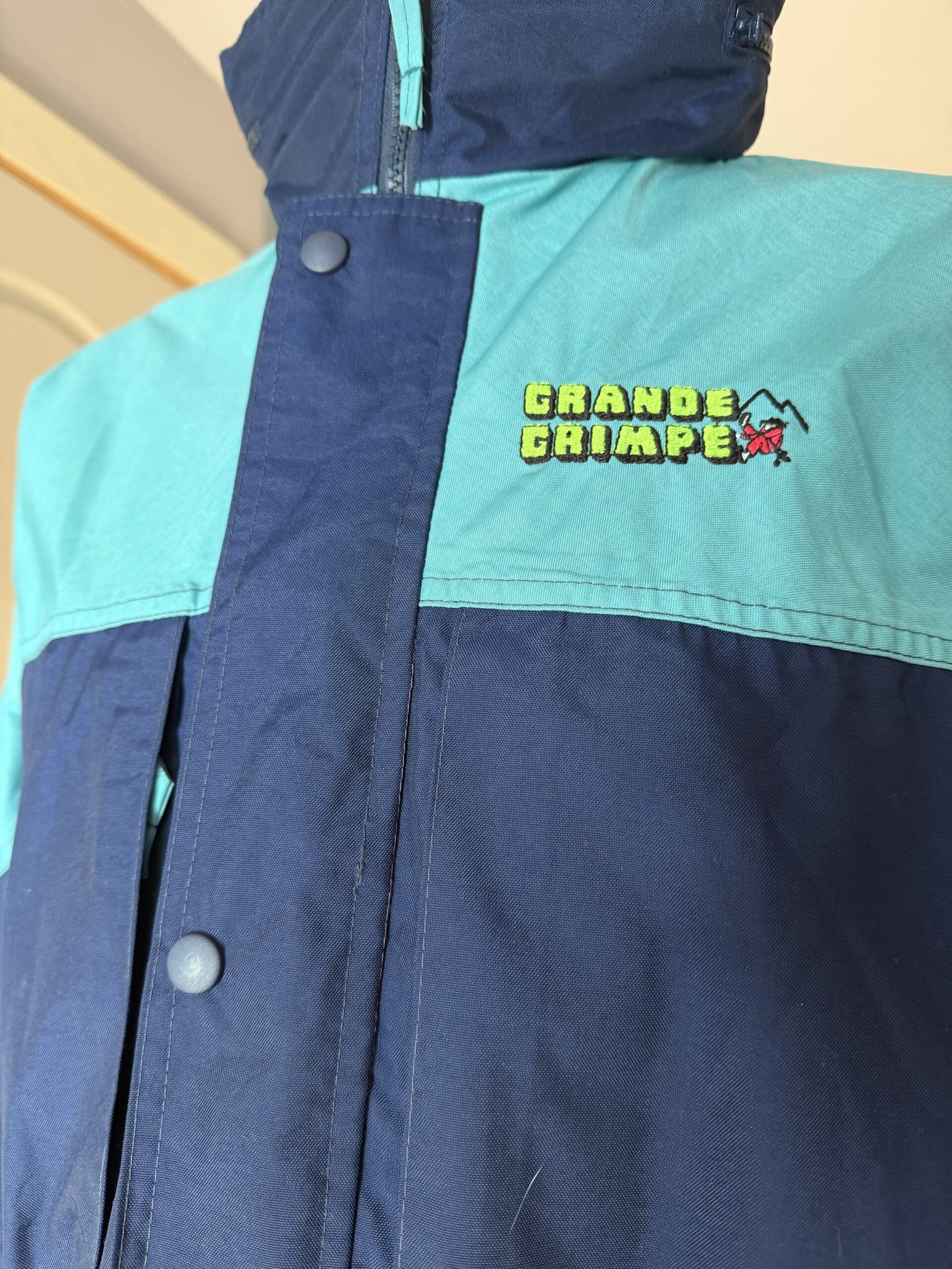 Chaqueta vintage de montaña Grande Grimpe en tonos azul marino y turquesa, con diseño retro de los años 90.