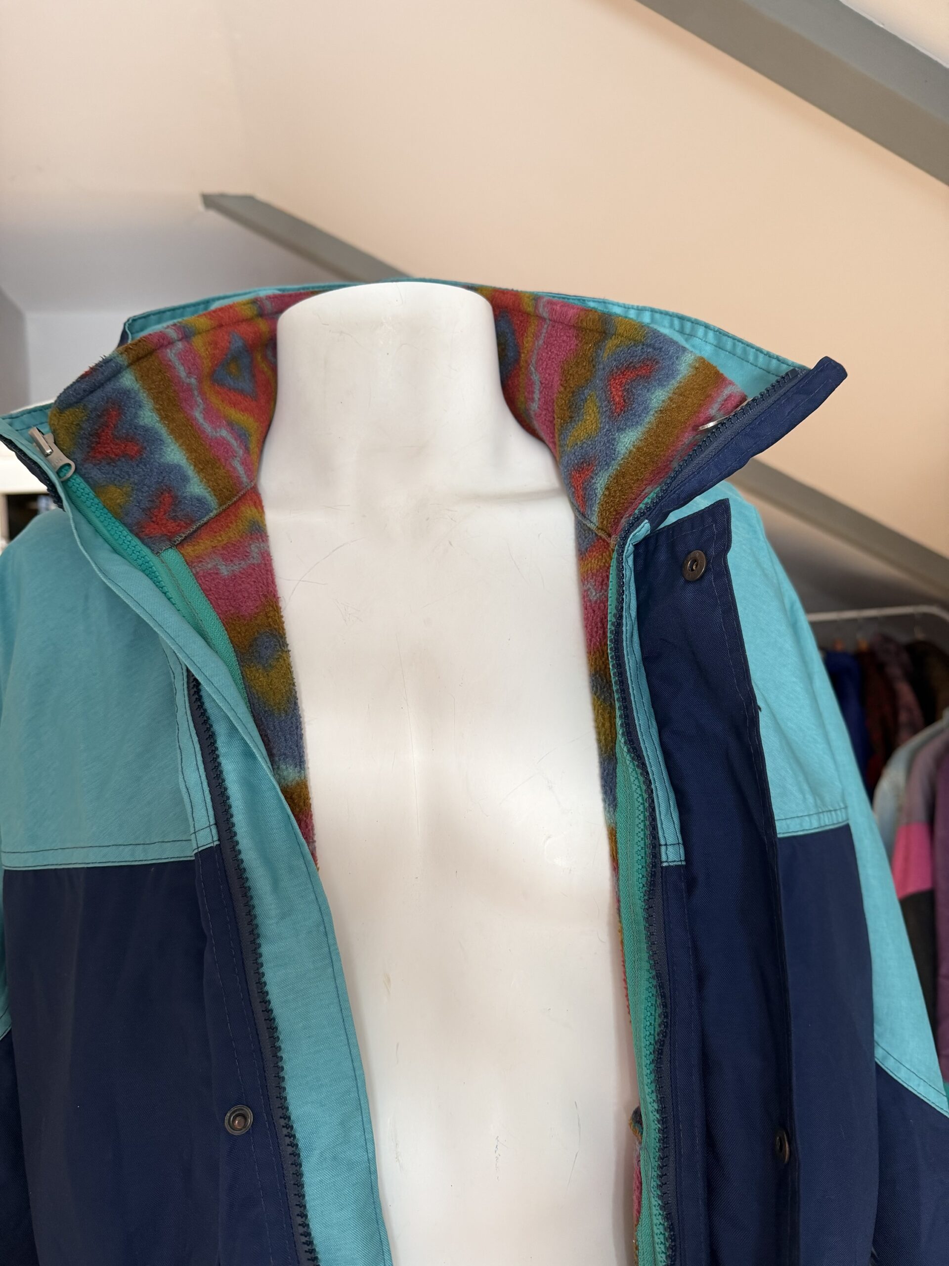 Cuenta con forro interior polar con estampado geométrico multicolor, que aporta abrigo y un estilo muy característico de la ropa técnica vintage.