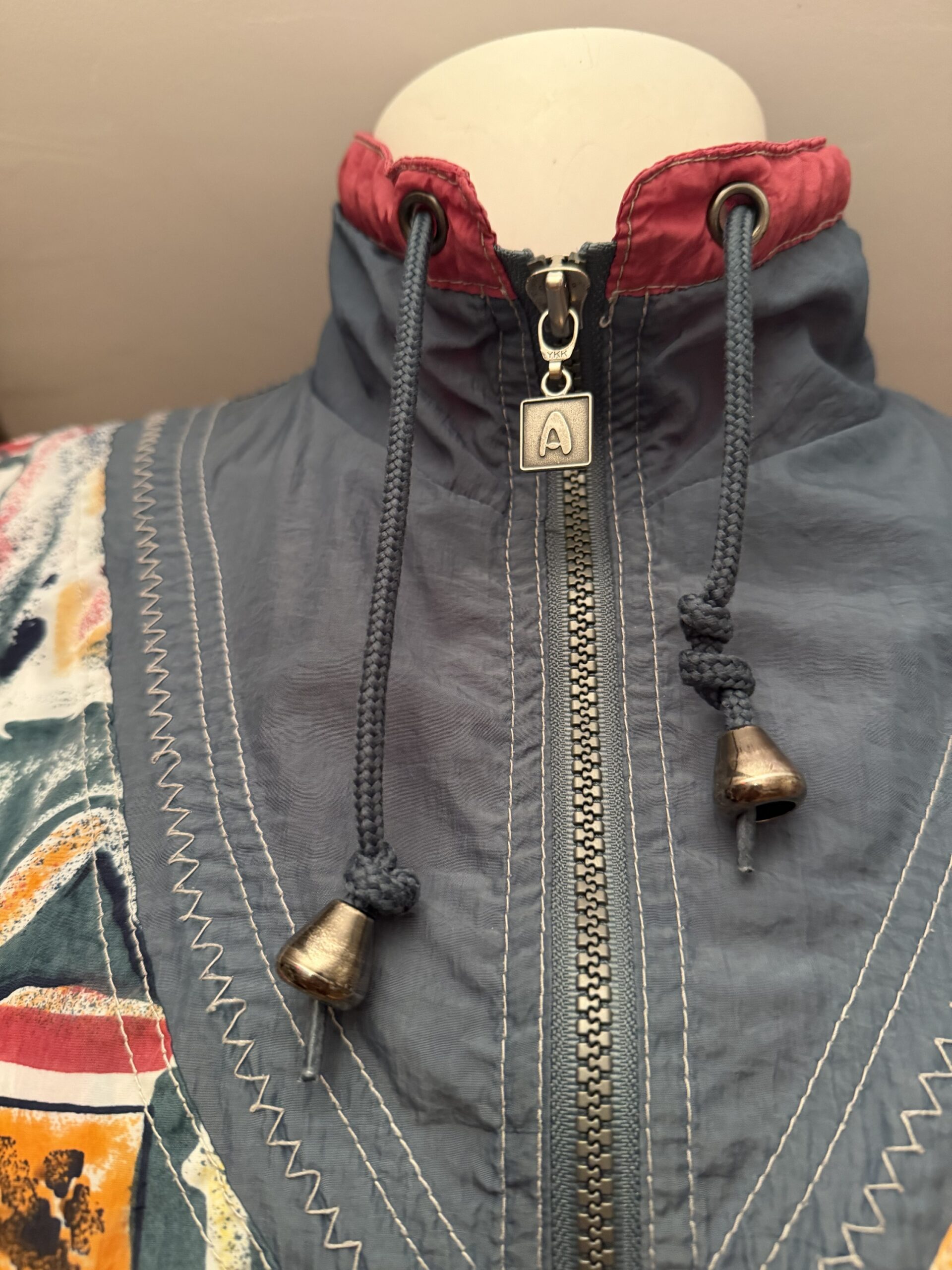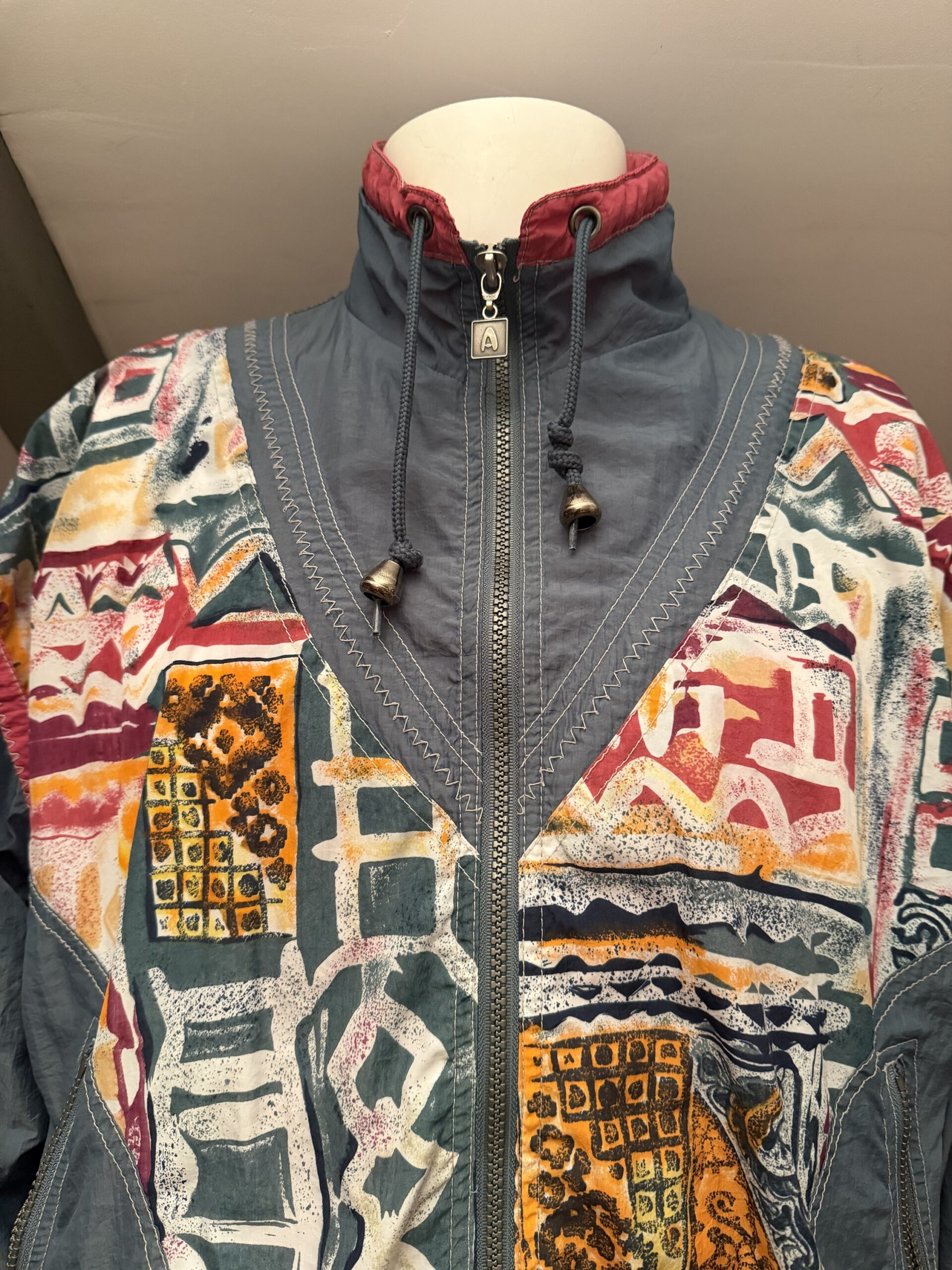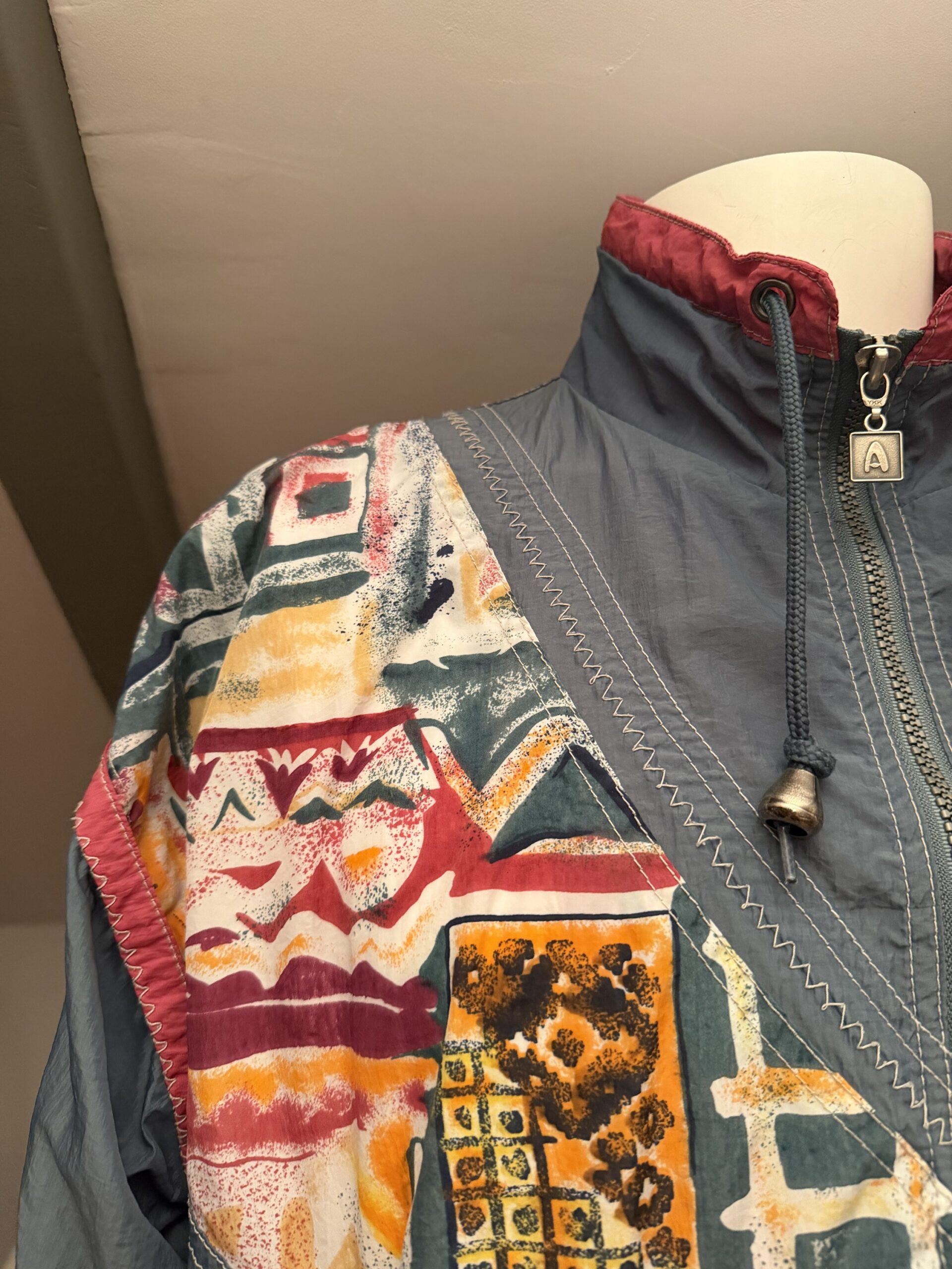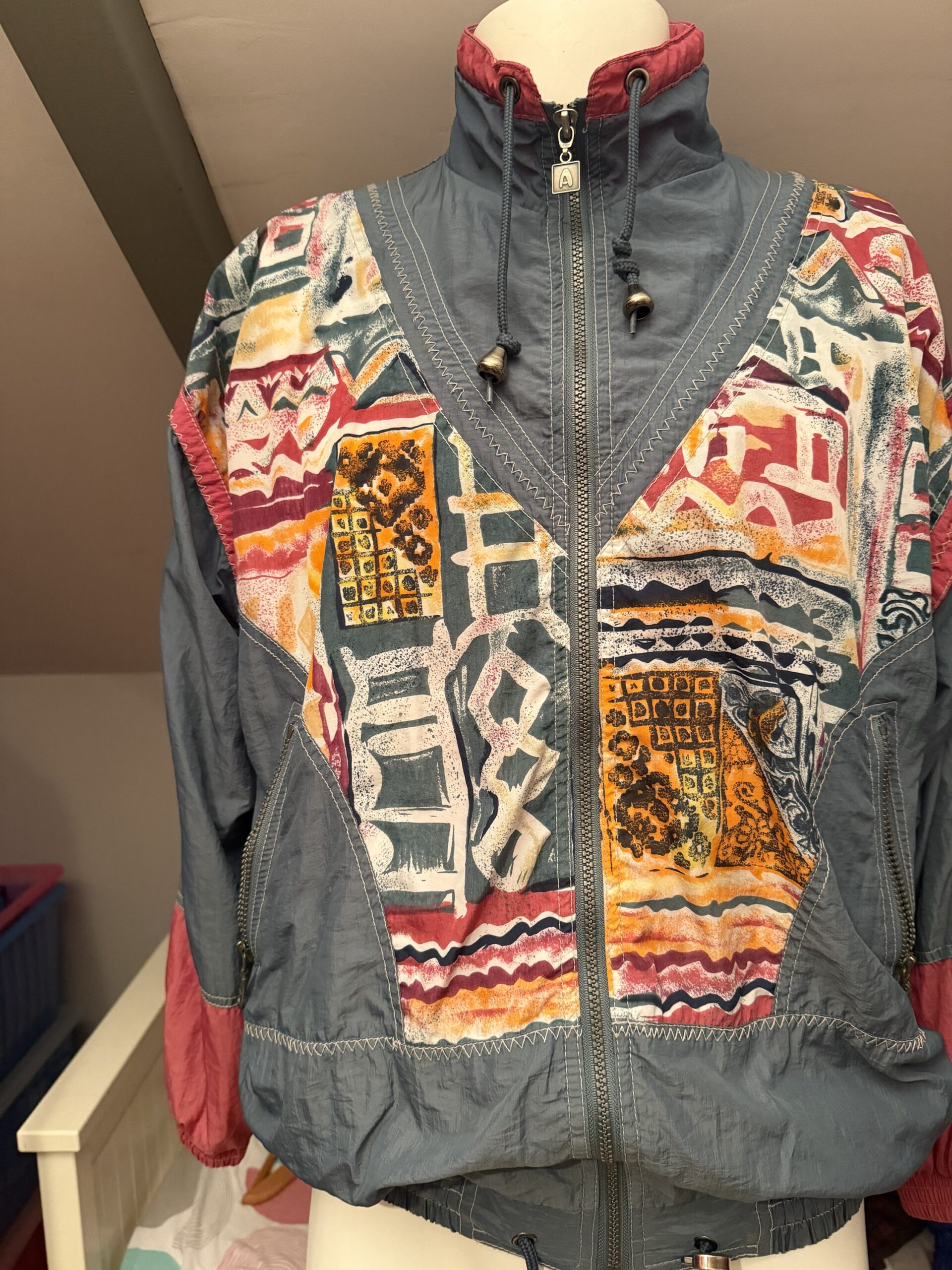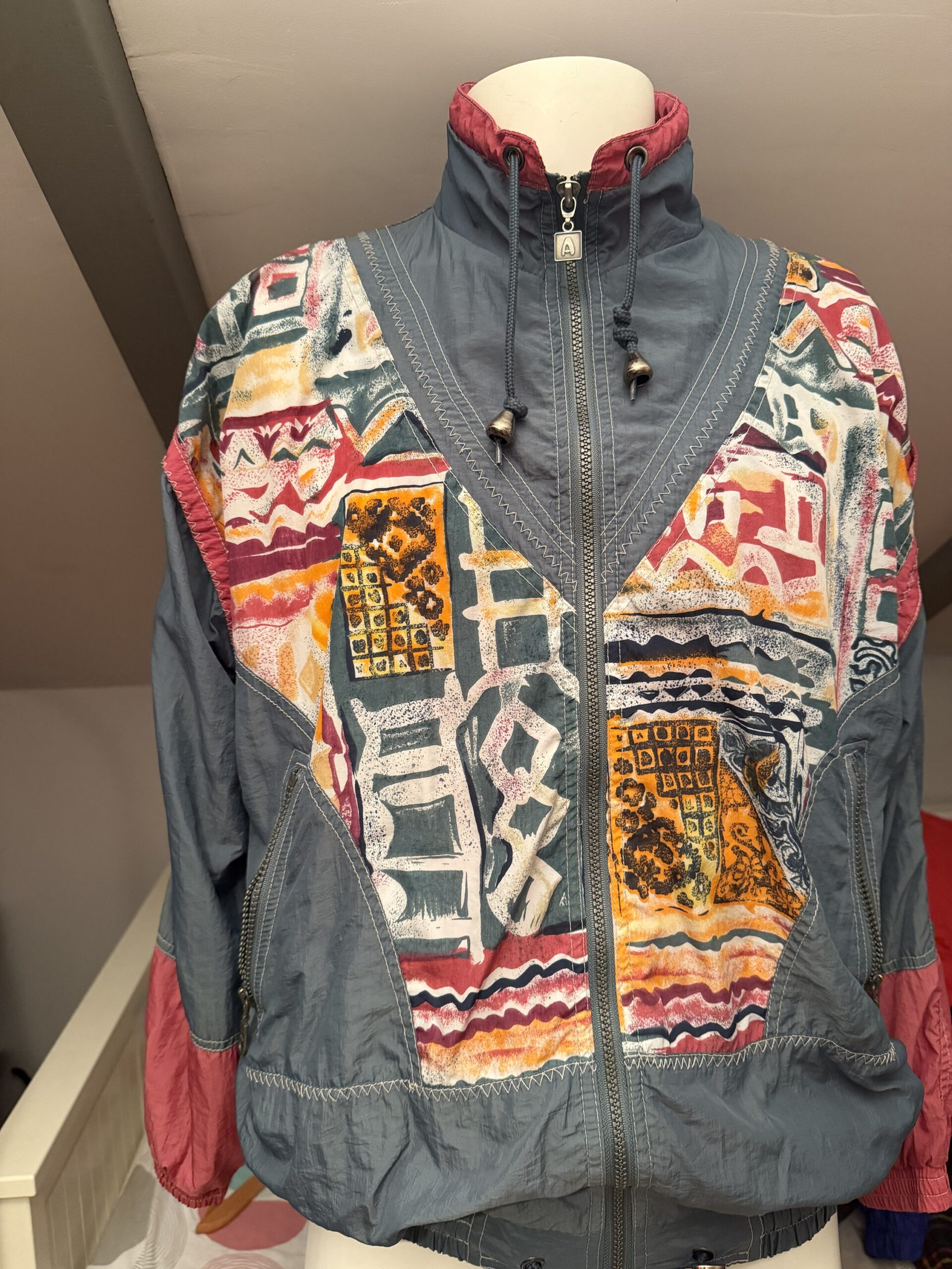Chaqueta vintage original de los 90 con diseño abstracto multicolor y rollazo retro brutal. Corte oversize, ligera y perfecta para looks urbanos con personalidad.