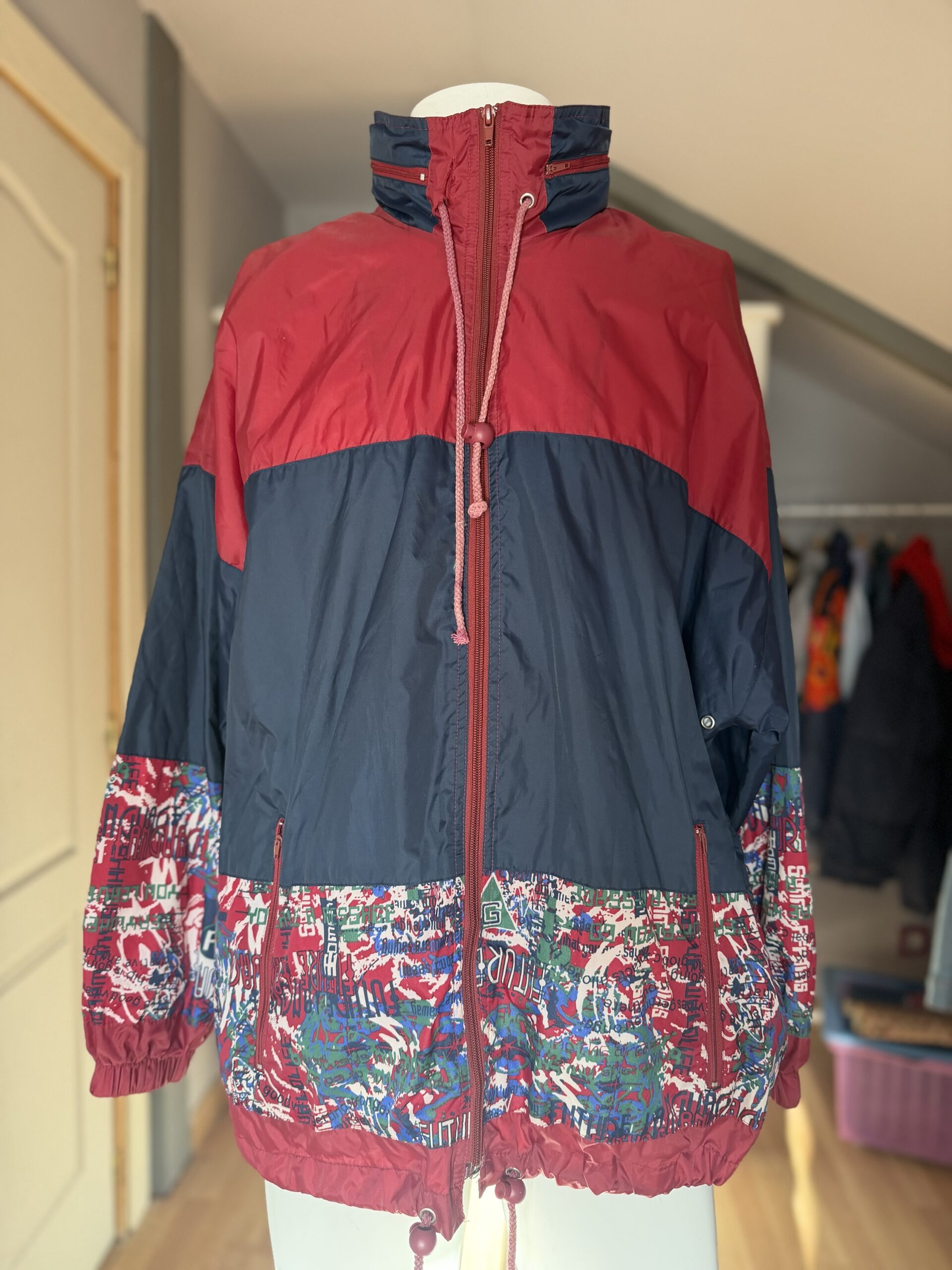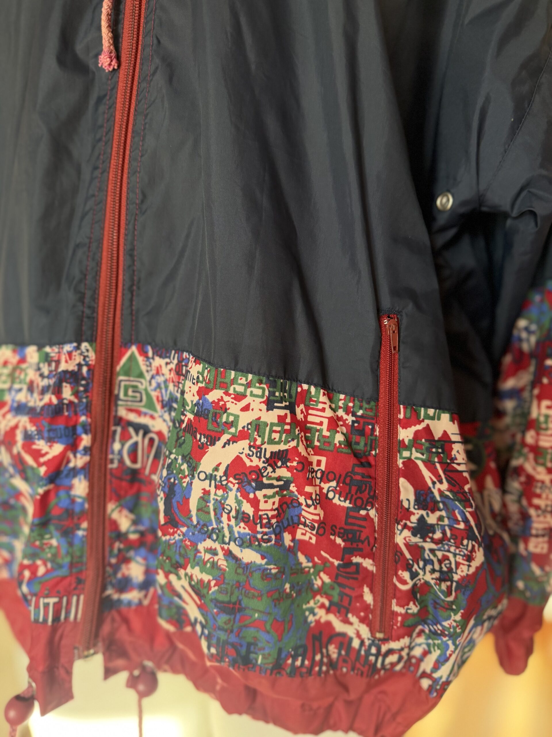 Chubasquero vintage estilo windbreaker retro 90s, con diseño colorblock en rojo y azul marino y panel inferior con estampado gráfico tipo grafiti multicolor.